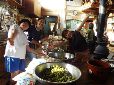 たくさんの梅を目の前に大喜びの竹輪丸・仲っちゃん・ゆべし。さて、この梅をどうするのさでしょうか?