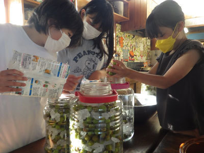 正解はみんな大好き〝梅シロップ〟です!丁寧に梅と氷砂糖を交互に瓶へ詰めていきます。「すごい綺麗!」「色も香りもいいね~」など、梅と氷砂糖が重なり合っていく様子を見て言葉が溢れました。