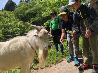 歩いている途中、道沿いのお宅が飼っているヤギに出会いました。予想外の近い距離感に驚きつつも、「この触れ合いは動物園に行かないと出来ないね!」と喜んでいました。
