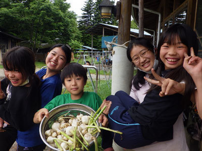 昨年度から育てていたニンニクの収穫です。ザル一杯に2.2キロもとれました。乾燥させて大切に使っていこうね。