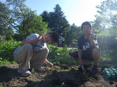 こちらは大豆の苗を植えています。タネから大切に育てた大豆の苗を昨年度よりも増やして植えます。味噌や豆腐作りなど、大豆を加工するチャレンジも計画しています。