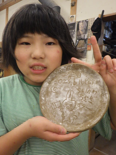 教室で竹輪丸は大きな夕食皿を作っています。作った日付と好きな絵を書き加えました。大事に使えば一生使える食器になります。日付や好きなものを書くことで、大きくなった時に自分がどんな気持ちで過ごしていたかを振り返ることもできます。焼き上がりが楽しみだね。