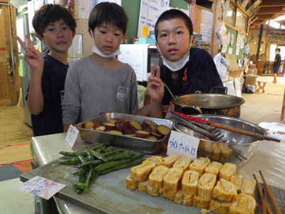 この日は小学校の給食がない日で、小学生が朝からお弁当作りを頑張りました。14人分のお弁当のおかずです。卵焼きが上手にできました。