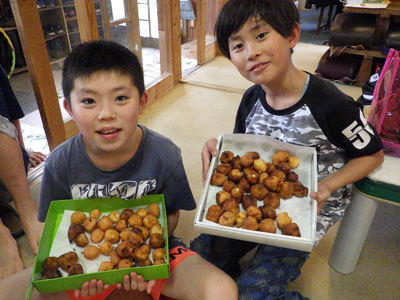時間がぽっかりと空いた休日の午後。まきとアキトがお菓子作りをしました。ボールドーナッツを全員分作ってご満悦です。