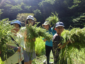 こどもたちが持っているのは素敵なブーケと思いきや…田んぼの雑草の王様「ひえ」です!田んぼの草取りは中々気が遠くなる作業ですが「ひえはすぽっと抜けるからハマる!」「僕こんなにとったぞ!」と、どんどん束がいっぱいになりました!