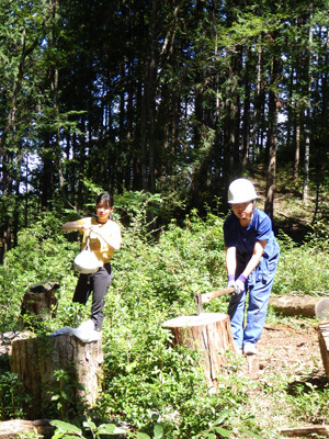 薪作業スタートです!丸太が持ち上げられないほど大きかったため、その場で薪割りをしました。効率よく薪を手に入れるためにも作戦をたてるのが大事です!