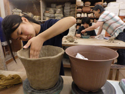 教室ではみーが大きな鉢植えを作っています。見本を横に置いて丁寧に仕上げます。