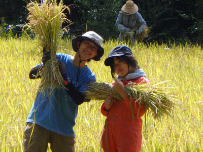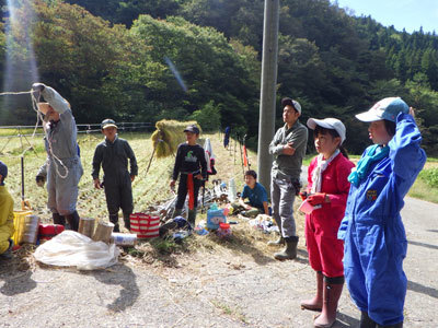 この日は春から育ててきた田んぼの稲刈りです。こどもが棟梁になって段取りを取ります。