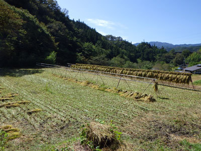 全部で20アールの田んぼ全てを一日で刈り終えました。ここから数週間ハザカケで干していよいよ脱穀です。
