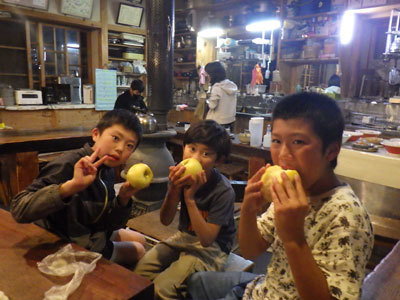 村の方から傷があって販売できなくなったりんごをたくさんいただきました。こどもたちは「甘くておいしい!」「丸ごと一個食べられるなんて幸せ〜」と夢中になって食べていました。