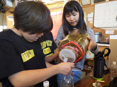 レクで提供する梅ジュースをボトルに準備するトリシアと竹輪丸。このだいだら自家製ジュースは、トリシアが“祭りのために”と5月に漬けてからずっととっておいたこだわりのジュースです。