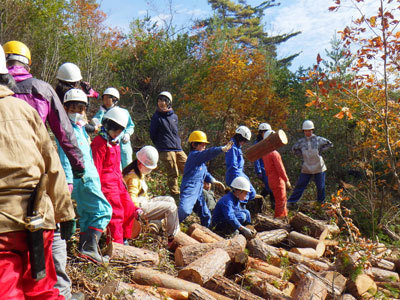 今日は陶芸作品を焼く「登り窯」で使うアカマツをとる山出し作業です。山の斜面にある大量の丸太をこども・相談員総出でおろします。まだ切たてでかなり重い丸太の数々もモチベーションを高く取り組めばあっという間に進んでいきます!