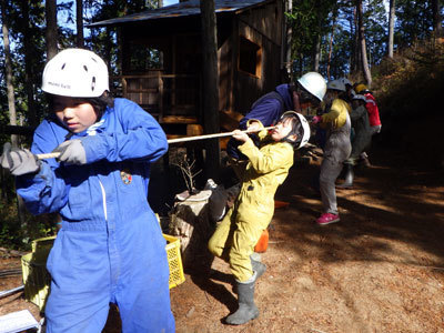 あきとは木の高い位置に登って滑車をつけています。人力だけでは運べない重くて長い木にロープを繋いで、滑車を使ってみんなで引っ張る作戦です!森の中ではその時々によって木の状態や環境の条件も様々なので、その状況に合わせてどの方法が自分たちの力を発揮できるかを考えて作戦を立てるのです。