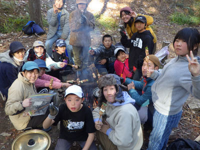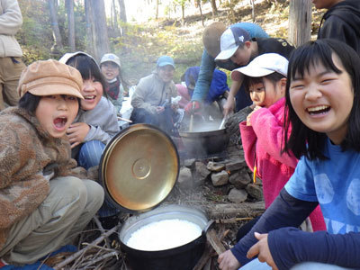 山出し作業をした森で週末はお楽しみのデイキャンプをしました。森の中で火を焚いてお昼ご飯をたべます。鍋の蓋をあけると…ふっくらお米の登場にこの笑顔です!