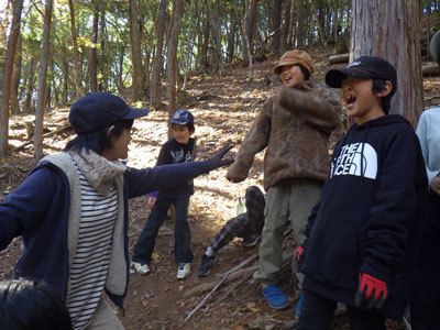 お腹いっぱいになったこどもたちは「だるまさんが転んだ」をしました。変なポーズをする仲間にみんなで大笑いです!最高の遊び場であり、薪をいただく場でもある森はこどもたちにとって特別な場所です。