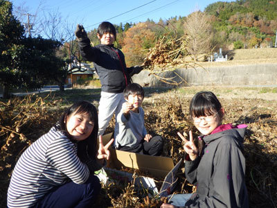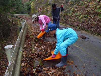 自分たちが普段使っている道路を掃除する村の作業をしました。道には夏から秋にかけてた落ちた枯葉がいっぱいです。いつもお世話になっている村の方の力になれるように一生懸命働きます!