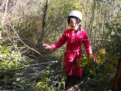 正解は“巨大迷路づくり”です!小さな木々の中から残す木を決めて、残さない木を切りながら道を開拓していきます。自分で自由に決められる楽しさを味わいつつ、森の整備ができる一石二鳥な時間でした。