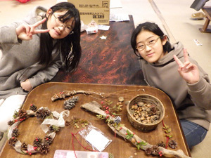 冬休みに地元に帰る前にラムネとすみれは流木や木の皮に森で集めた木の実やどんぐり、松ぼっくりをあしらって素敵なオブジェをつくりました。家族にもふたりがだいすきな森の空気を感じてもらえるね。