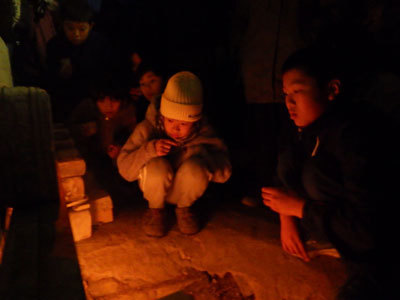 みんなが書いた半紙に点火して、登り窯がスタートしました。「この火が1,200℃まで上がっていくのか…」とワクワクしながら、小さな火をじっと見守るこうだいとオオダコです。