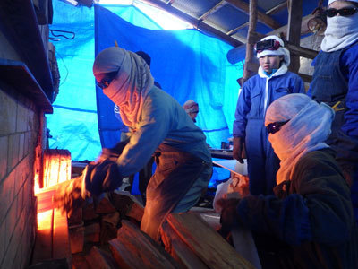 手早くかつ正確に薪をくべるためには受け渡す人とのコンビネーションが重要。「いち!に!さん!…」と2人で数を数えて息を合わせながらテンポよく入れています。