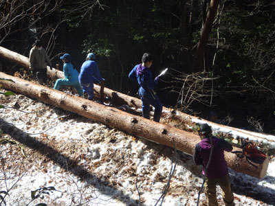 村の方からお声がけしてもらっていた、風呂焚き用の赤松を取りに行きました。大木でしたが、作戦を考えて作業開始です。