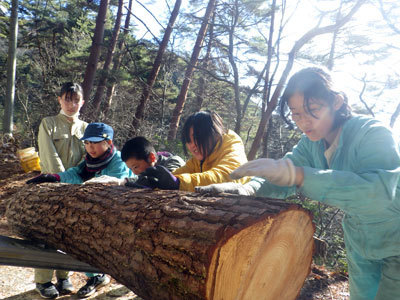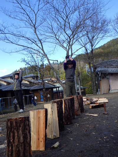 あだっちーは取ってきた赤松の大木を見事に割っていきます。3年間で鍛えた薪割の実力は本物です。