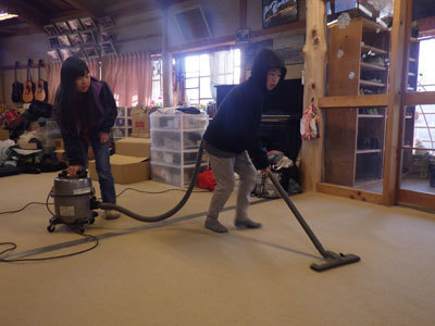 2年目のゆいが1年目のなっちょるに掃除機のかけ方を教えています。自分たちが使う場所も自分たちで掃除します。1年目だってしっかり暮らしの仕事を担います。