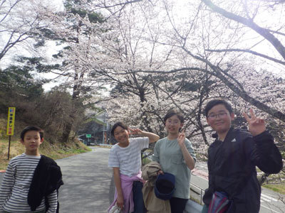 あいさつまわりは村の中を歩いてまわりました。泰阜村は自然がいっぱいなので歩いていると“春“を感じるものをたくさん発見します。満開の桜がきれいで嬉しくなるね。