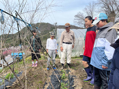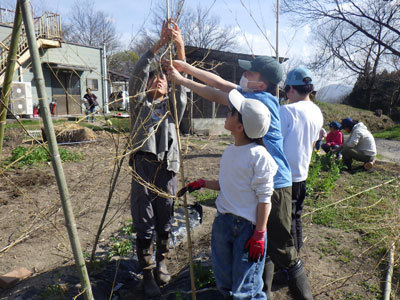 さやえんどうを育てているこどもたち。いつもお世話になっている村の方にさやえんどうの支柱の立て方を教わりました。泰阜村で長年野菜づくりをしている村の方はこどもたちの1番の師匠です。