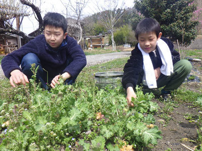 ただっちとモクが畑で収穫しているのはちりめん冬菜です。「今晩の夕食でナムルとしてだそう!」と張り切って収穫しました。