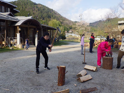 薪割りレクチャーとして、くさびを使った割り方を説明する2年目のオオダコ。やり方のポイントや危険なことを、今までの経験も踏まえながら自分の言葉で1年目のメンバーに伝えています。