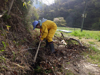 村の方から畑の支柱の立て方を教わる1年目のダイキ。困ったときは自分たちで調べるよりも、村の方から教わることで泰阜での暮らしに合った知恵とコツが学べるのです。