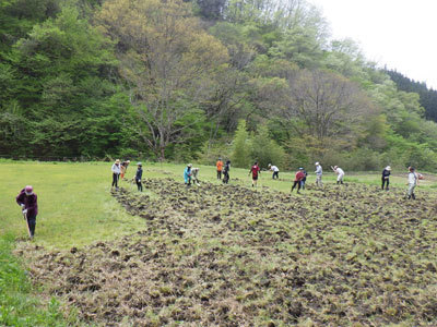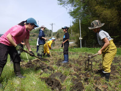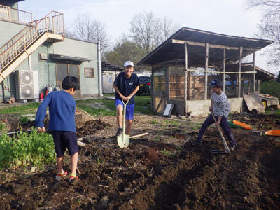 畑も作物を植える準備を始めました。肥料を混ぜ込んで耕します。田起こしと畑起こしでだんだん道具の使い方も上手になってきました。