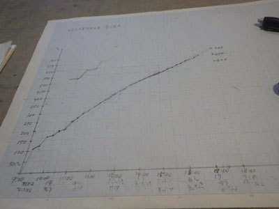 こどもたちが当番中に記録した温度グラフです。実はグラフから今の窯の状況を知ることができます。次の当番のこどもに窯の状況を引き継ぐためにも大切な資料になるのです。