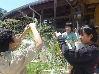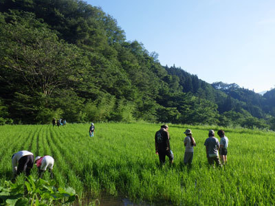 夏空の下、全員で田んぼの草取りをしました。田んぼの中で先を見ると気が遠くなってしまうので、ひたすらおしゃべりをしながら草を踏んだり抜いたりしました。すると終わらないだろうと予想していた3枚の田んぼを全てやり切りました!
