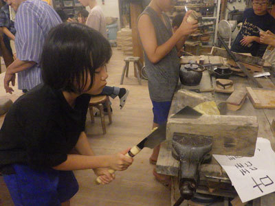 ものづくり教室では、じっと自分の作品に向かう姿が増えてきました。仲っちゃんも黙々と自分の足のサイズに合わせて木材を切り取り、下駄作りに励みます。