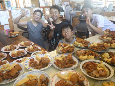 朝からお勝手は大賑わい。今日は小学生の運動会を応援するため、朝から中学生がお昼ご飯を準備してくれました。5時半から準備した40人分の豪華な食事がずらりと並び、圧巻です。