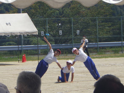 高学年は今まで練習してきた組体操を披露しました。真剣な立ち姿やピンと手を伸ばす様子を見て、普段とはまた違った、仲間の新しい顔を知れた一日だったね。