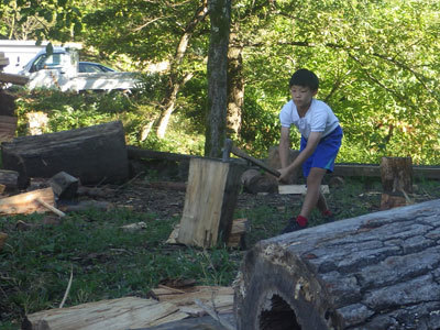 運動会を終えて、みんながゆったりと時間を過ごす中、モクは薪割りをしています。最近では、隙間時間を見つけては薪割りに熱中しているモク。少しずつ大きな薪も割れるようになり、いつも隣には山積みの割れた薪が積まれています。