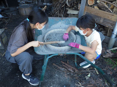 ゆいとのはは、風呂焚きで燃やした廃材の灰の中にある鉄くぎを探しています。釘が入っていると誰かが怪我をするかもしれないので、地道だけれど大事な作業です。