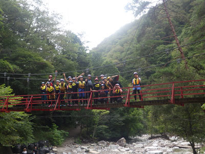 水深は浅く、流れのある万古川では登るだけでなく流れるのがみんなの楽しみ方。川の流れを読みながら、バランスをとって上手に流れます。まるで、天然のウォータースライダーです。