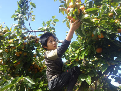 実りの秋はこんなところにも!庭の柿がきれいに色づき食べごろになりました。そして、柿が色づきやってくるのがおさるさん?ではなく、なっちょるです。庭の柿は、こどもたちにとっていいおやつになります。