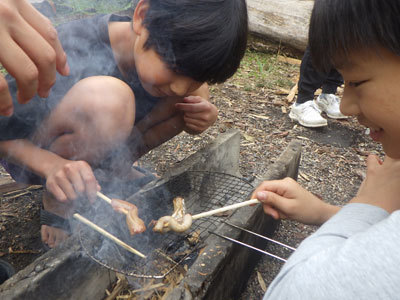 こどもたちが焼いているのはなんとヘビ!?薪作業中に見つけたヘビをこどもたちが「食べてみたい」と興味津々。責任をもってできるならということで食べることしました。命に感謝してさばくところから最後までやり遂げました。