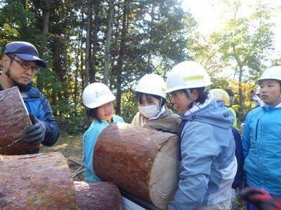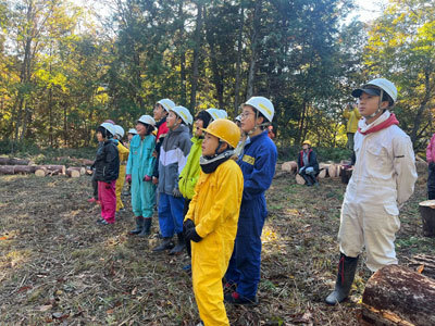 大きなヒノキを切り倒す様子を見学しました。木の伐倒をみるのは今年度初めてです。大迫力な様子と『ドスン』と響く重たい音に思わず「うわぁ…!」「すごい!」と圧倒されました。