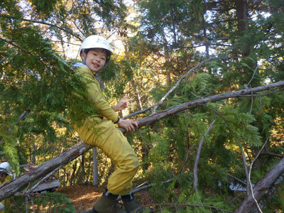 切り倒したヒノキにこどもたちが集まり、アスレチックのように登ったりぶら下がったりして遊び始めました。木で遊ぶっておもしろいよね!