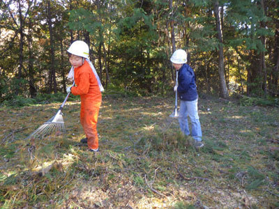 作業の最後の片付けはしっかりと行います。だいだらぼっちは山を持っていないので、今回も村の方のご好意で木を伐らせてもらいました。感謝の気持ちをこめて落ち葉や枝をかき集め、整備しました。