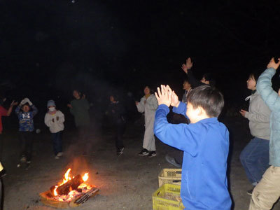 締めはキャンプファイヤー。猛獣狩りゲームや119回の団結踊りなど、最後まで遊びつくしました。おいしいものを食べ、体を動かして遊び、合計6時間(笑)。心も体もあたたまる打ち上げパーティになりました。