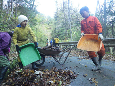 村の道路掃除の活動に参加しました。道端にたまった落ち葉をかき出して集めます。周りは山ばかりなのでとんでもない量の落ち葉が落ちていました。ですが人の力も負けていません。集中して作業をおこない、あっという間に終わりました。