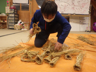 お正月に向けて、玄関飾りの『おやす』をダイキが作っています。おやすは長野県の風習で、稲を使って編んで作ります。以前作り方を習ったのでどんどんうまくなっていきます。できあがっていく実感が楽しいようで、次々と作っていきます。