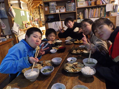 みんなで作った手作りの餃子は、美味しすぎて頬張って食べています。しかも今日のご飯は、なんと自分たちで育てた初めての新米です!